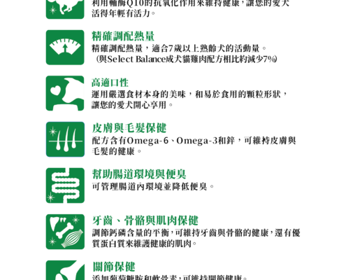 富含7歲以上成犬所需的營養,與維持健康的抗氧化成分。