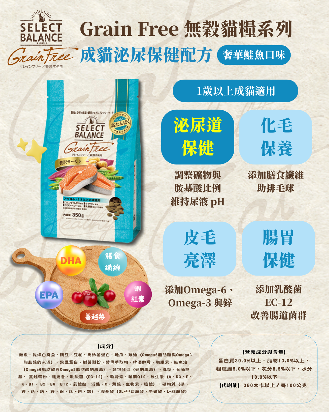 鮭魚、乾燥白身魚、豌豆、豆粕、馬鈴薯蛋白、地瓜、雞油(Omega6脂肪酸與Omega3脂肪酸的來源)、豌豆蛋白、樹薯澱粉、酵⺟萃取物、啤酒酵⺟、纖維素、鮭魚油(Omega6脂肪酸與Omega3脂肪酸的來源)、麵包酵⺟(硒的來源)、寡糖、葡萄糖胺、蔓越莓粉、迷迭香、乳酸菌(EC-12)、軟骨素、輔酶Q10、維生素(A、D3、E、K、B1、B2、B6、B12、菸鹼酸、泛酸、C、葉酸、生物素、膽鹼)、礦物質(磷、鉀、鈣、鈉、鋅、銅、錳、碘、鈷)、胺基酸(DL-甲硫胺酸、牛磺酸、L-離胺酸)
