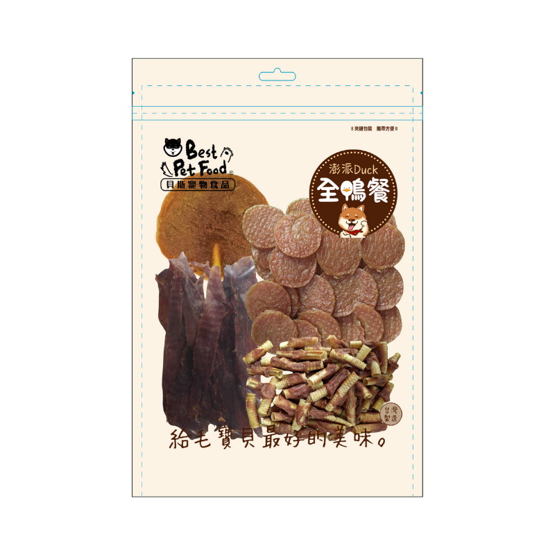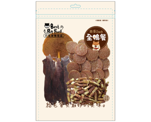 鴨里肌(鴨肉、植物性甘油、維生素E)、鴨肉造型Q餅(鴨肉、植物性甘油、維生素E)、鴨肉脆脆一口酥(鴨肉、鴨氣管、植物性甘油、維生素E)、巨巨脆笛棒棒糖-鴨肉(鴨肉、鴨氣管、植物性甘油、維生素E)